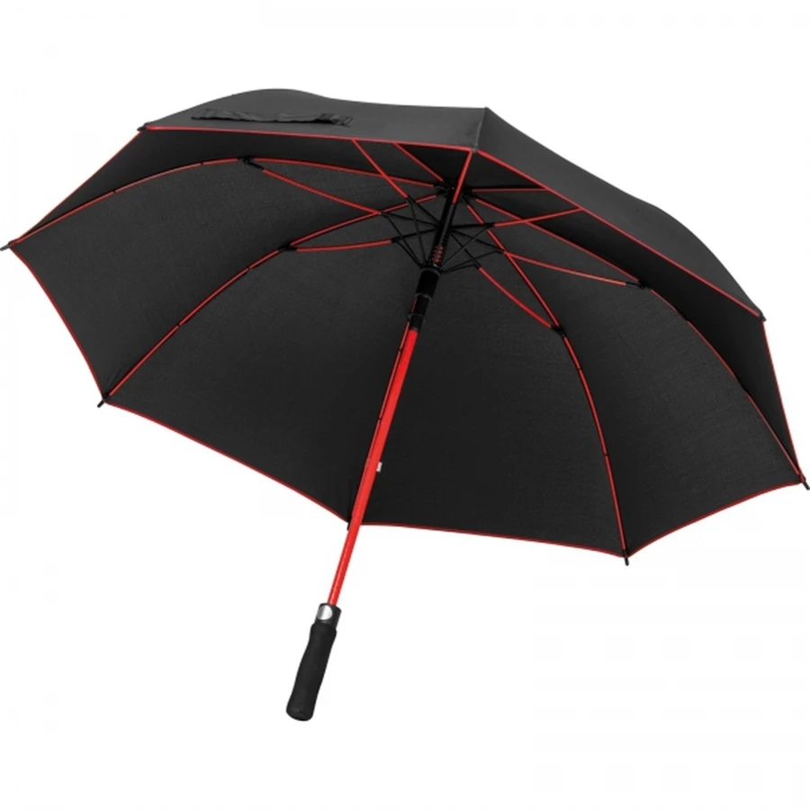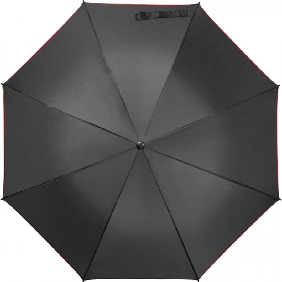 Black stick umbrella made of 190T pongee with coloured edge, automatic opening and fibreglass poles.
