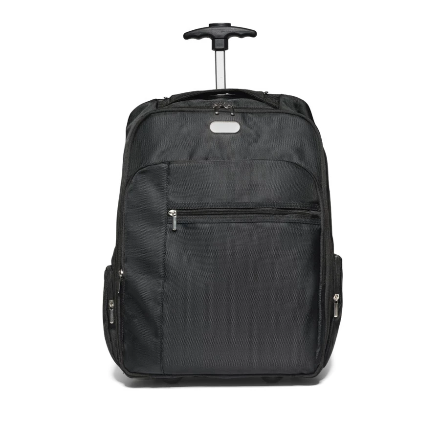 Laptop trolley backpack that combines the duality of a backpack and trolley, making transport easier, while ensuring spacious and well-distributed storage. Includes a removable metal plate with a magnet for easy customisation. Laser-engraved plate supplied separately from the trolley.Outer material: 1680D and 300D polyesterInner material: 210D polyesterComputer pocket: 17''Capacity (L): 28Compartments: 1 main compartmentExternal pockets: 2 front pockets and 2 zipped side pocketsAdditional features: padded wheel protector, extendable metal handle, removable metal plate for personalisationPromotion up to 15% discount valid from 03/11/2025 to 12/12/2025 and limited to existing stock. For more information about the conditions of this promotion, please contact your account manager. 330 x 490 x 220 mm | Plate: 50 x 20 mm