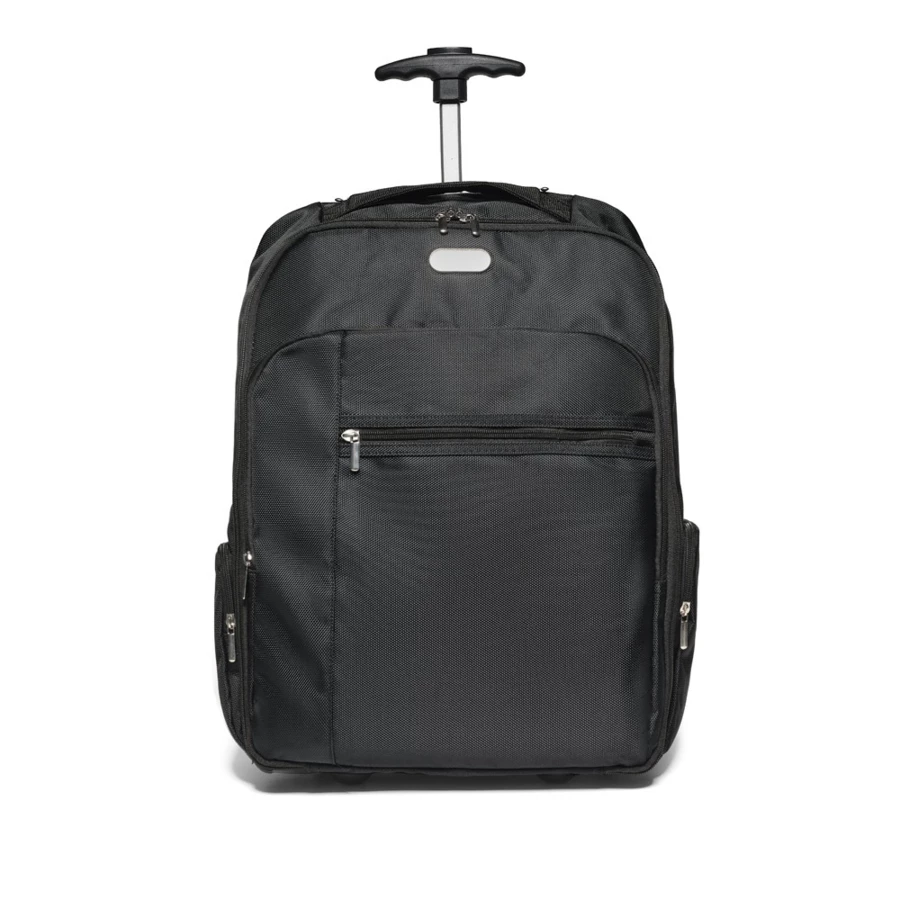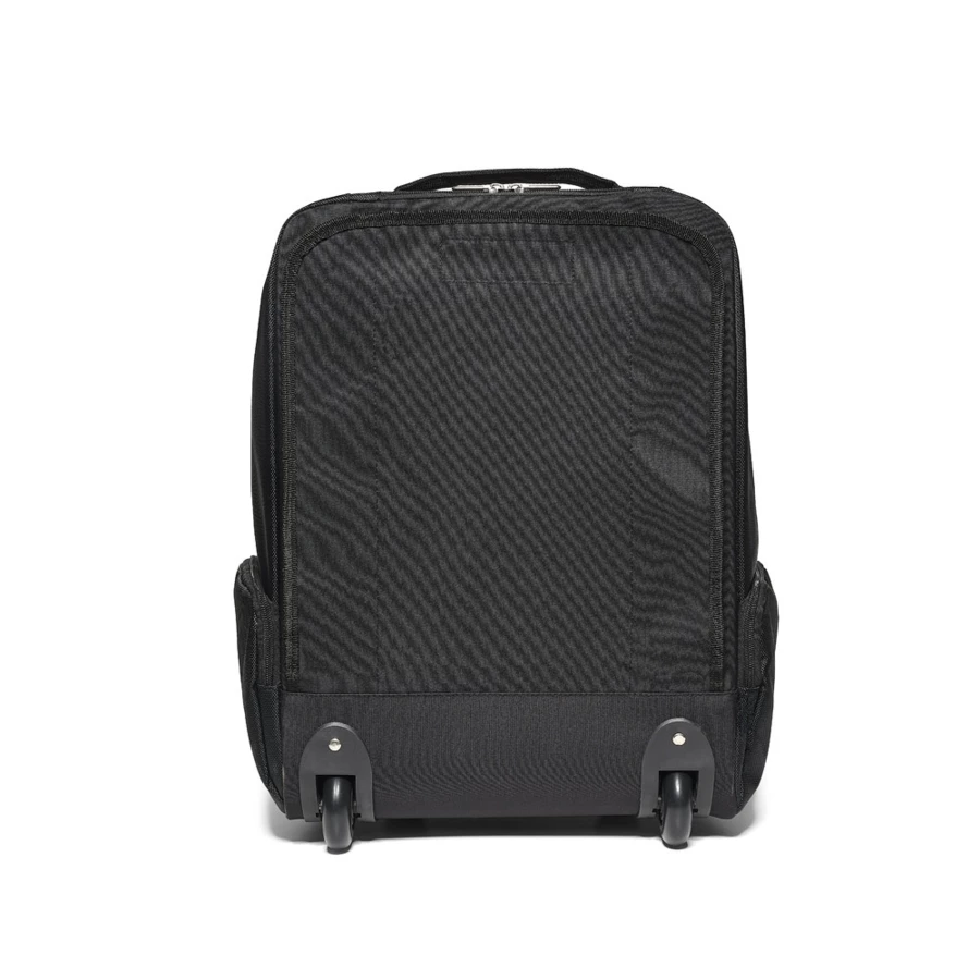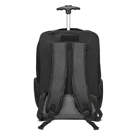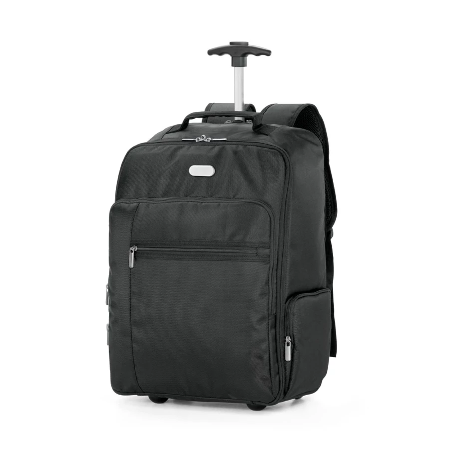 Laptop trolley backpack that combines the duality of a backpack and trolley, making transport easier, while ensuring spacious and well-distributed storage. Includes a removable metal plate with a magnet for easy customisation. Laser-engraved plate supplied separately from the trolley.Outer material: 1680D and 300D polyesterInner material: 210D polyesterComputer pocket: 17''Capacity (L): 28Compartments: 1 main compartmentExternal pockets: 2 front pockets and 2 zipped side pocketsAdditional features: padded wheel protector, extendable metal handle, removable metal plate for personalisationDimensions: 330 x 490 x 220 mm | Plate: 50 x 20 mm