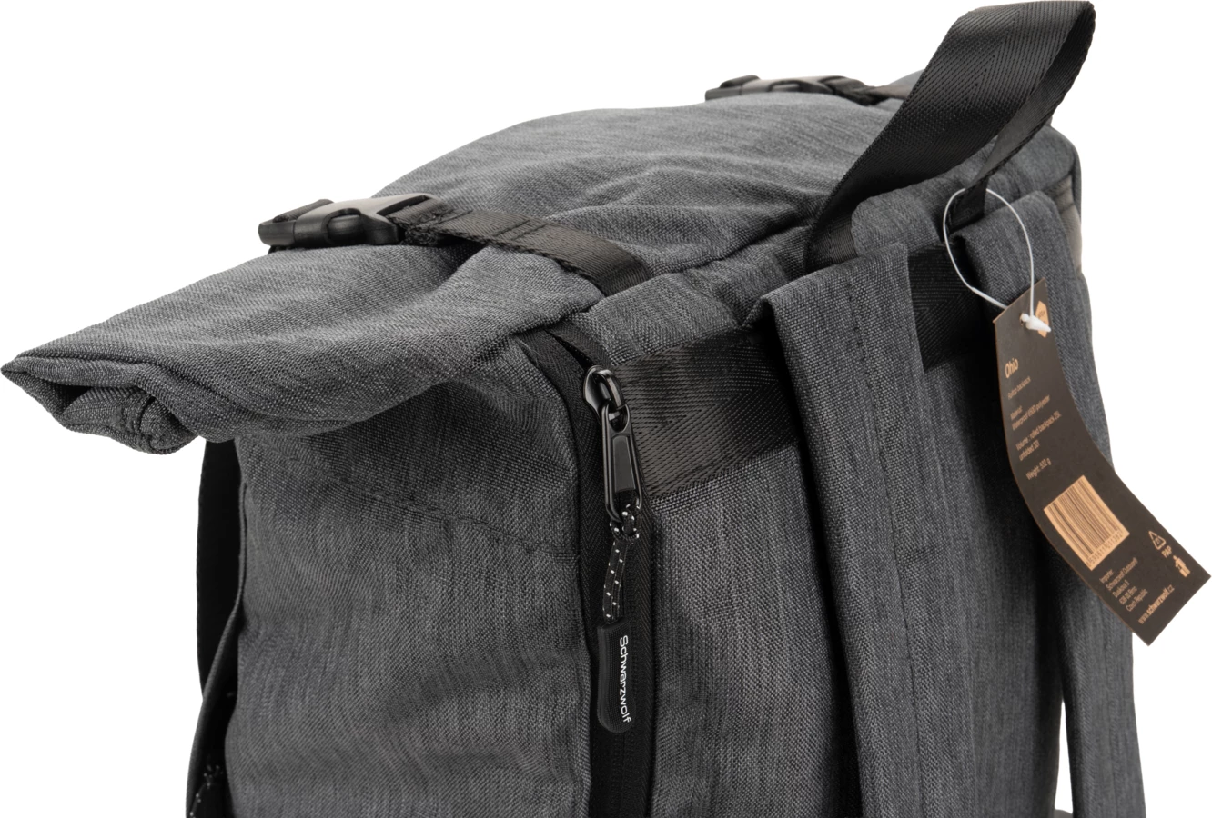 Practical rolltop Schwarzwolf backpack in a grey colour is suitable for tourism as well as every day use. The backpack has two small front zipper pockets, two sides pockets and a back zipper entry to the main compartment which includes one big separated pocket and small pocket for accessories. After rolling it fastens with two plastic buckles. The backpack has a padded back and shoulder straps. Volume: rolled backpack 25 l, folded backpack 32 l