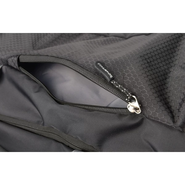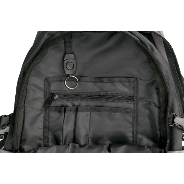 Practical backpack with padded back system, padded shoulderstraps with handles, practical pocket for a laptop witha protective reinforcement, two bottle pockets, compression straps, inner pocket with compartments for small items and a small carabine, stash pocket. Material: 300D Nylon, Dobby nylon, 210D Polyester. Volume: 27 l.