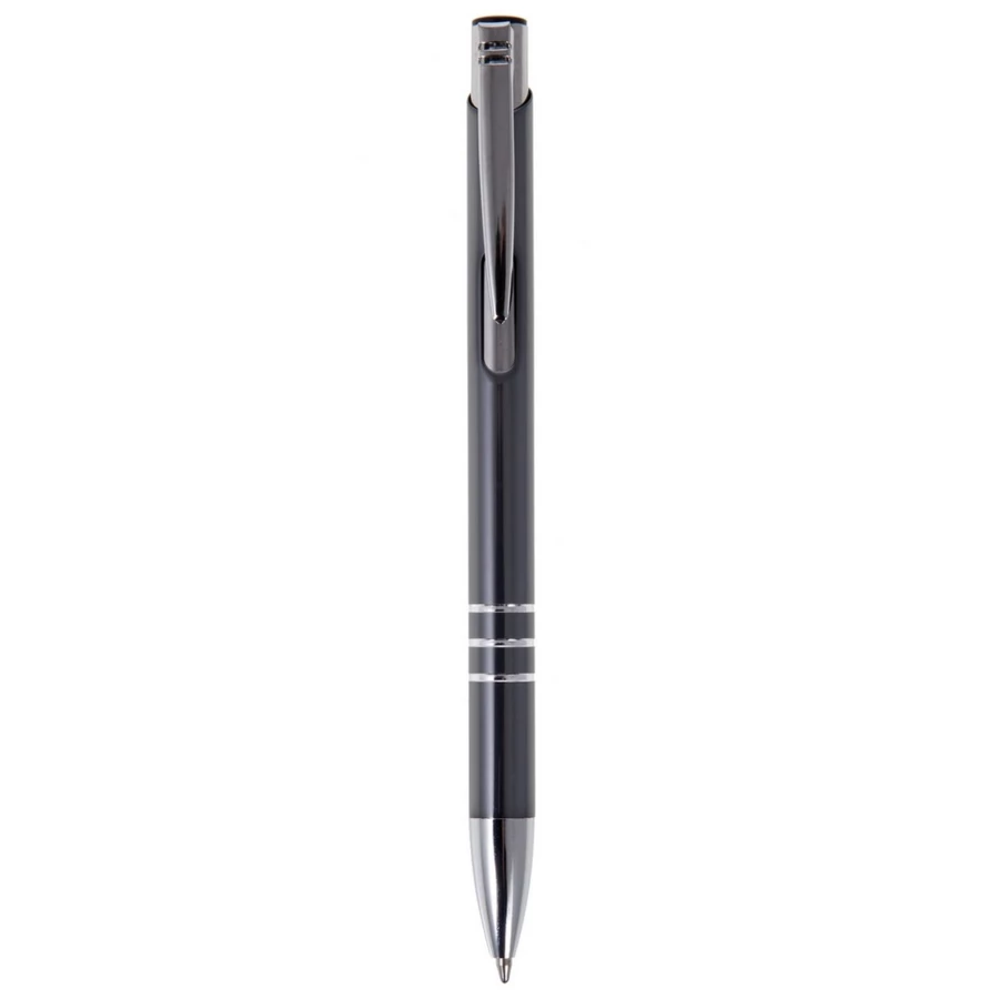 Ball pen, coloured barrel with shiny finish, features trim parts in silver colour, writes in blue, product made from aluminium