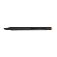 Ball pen with black barrel, features a rubber finish, coloured stylus tip enables touch screen operation, the engraved surface colour can be white or similar to the stylus tip, writes in blue, product made from aluminium