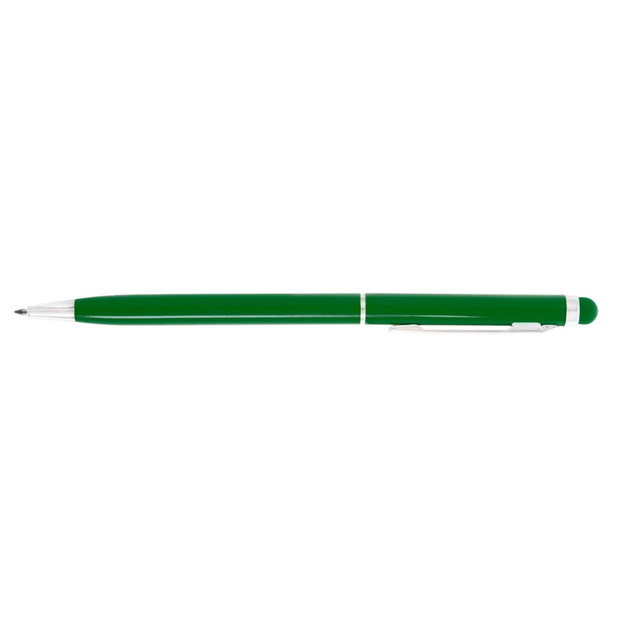 Pointer ball pen with twist mechanism and ultra-fine aluminum body in a smooth metallic finish in varied colors and matching color stylus. Details and rings in silver color. Blue ink.