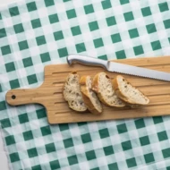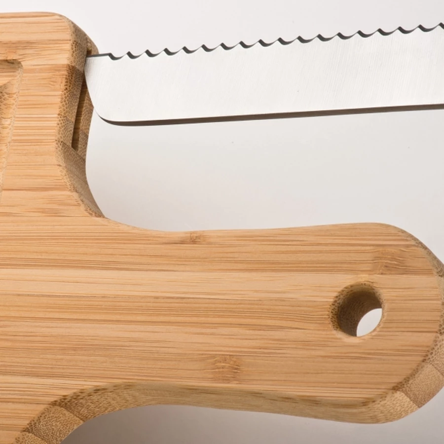 High-quality set consisting of a massive chopping board made of bamboo and a large bread knife made of stainless steel. Just put the knife into the matching immersion on the board side. The board offers a practical handle and two different surface structures, depending on what you want to cut.