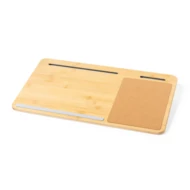 Multifunctional organizer mat in nature line. Made of bamboo and natural cork, contributing to the sustainability of the planet. Including holders for laptops, tablets and other mobile devices. With integrated, soft-touch mouse pad. Besides, it incorporates padding for the knees, enabling comfortable use for long periods of time. Including practical carrying handle.