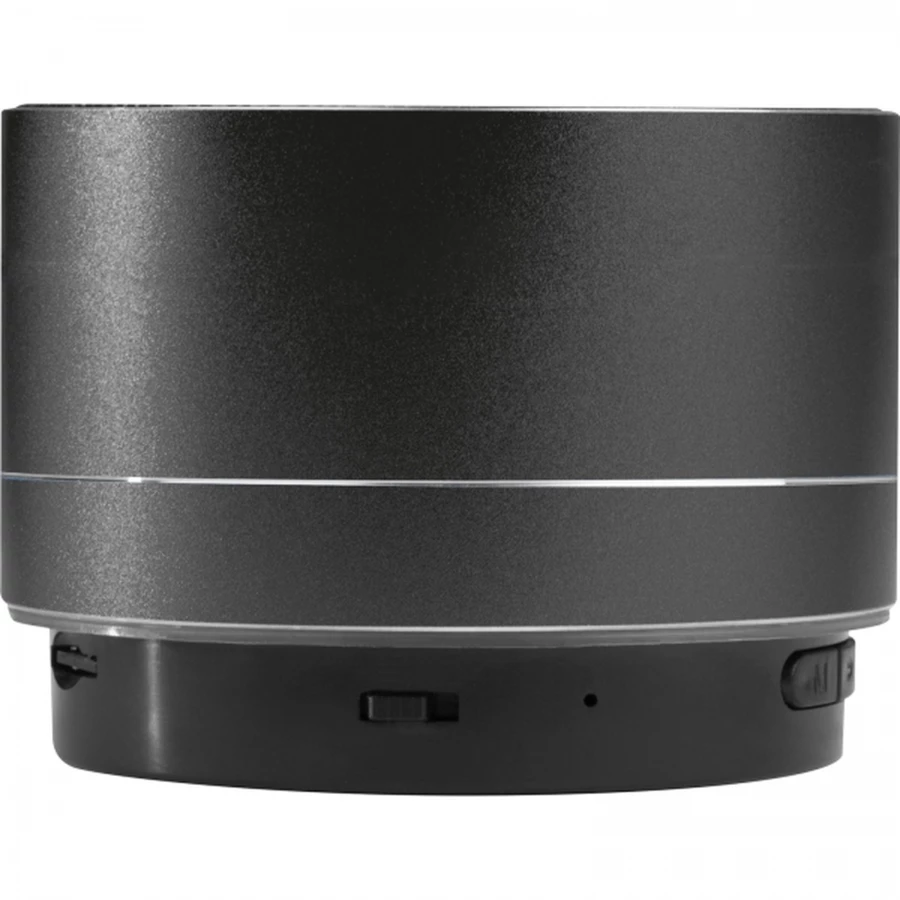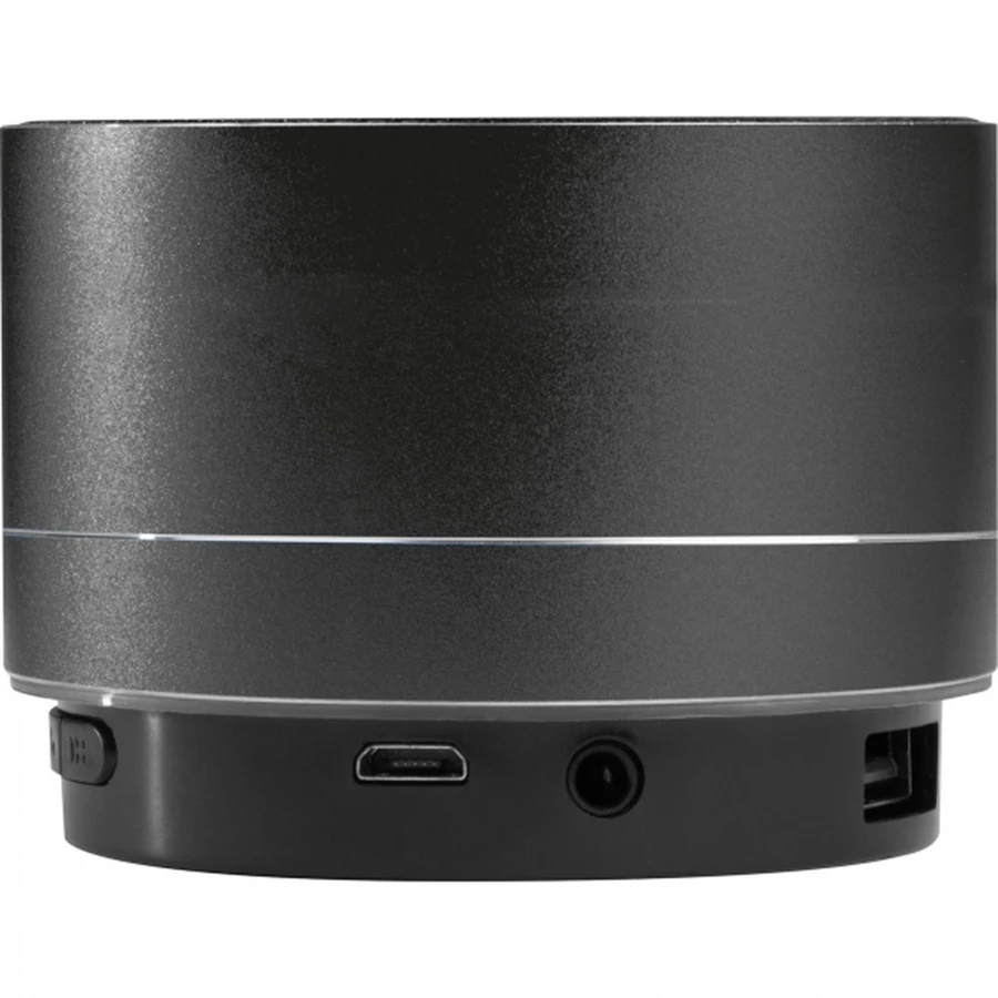 Round bluetooth speaker in aluminium with built-in rechargeable battery, integrated radio, TF card slot, and flashing LED light on the bottom; micro USB charging cable included. We will engrave your logo on the speaker.