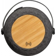 Bluetooth speaker (5 Watt, battery: 1200 mAh) made of recycled PET with induction charging surface (15 Watt) made of bamboo incl. USB-C charging cable ( ca. 50 cm). Your logo will be laser engraved on the bamboo surface.