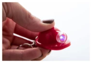 Plastic safety helmet shaped keyring with LED flashlight. With button cell battery.