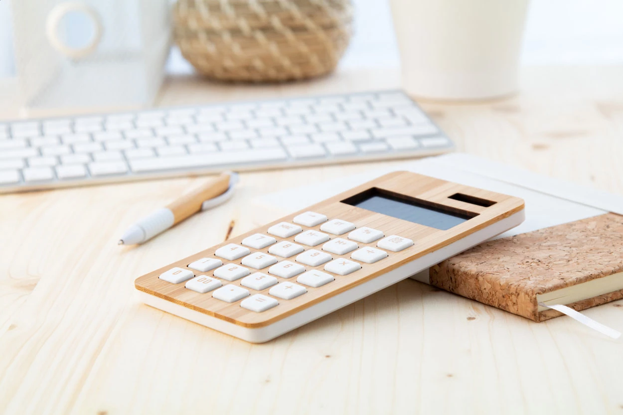 12 digit solar powered calculator in bamboo and plastic housing. Including button cell battery.