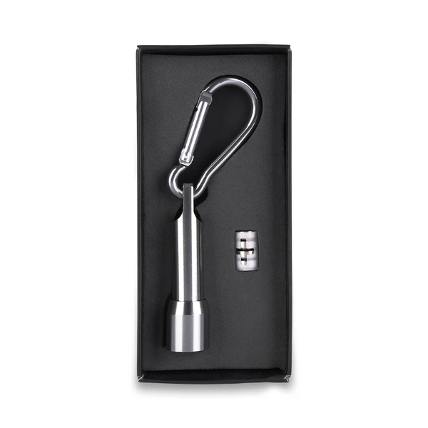 Brelok latarka LED z karabińczykiem. Zasilana 4 bateriami AG3 (dołączone do produktu). Pakowana w czarne opakowanie upominkowe.