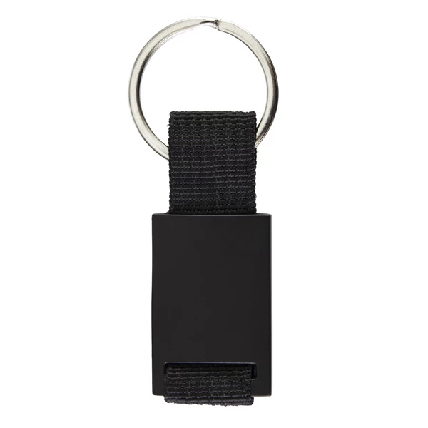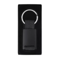 Elegancki brelok o czarnej matowej powierzchni. Wykonany z metalu i poliestru. Pakowany w czarne pudełko upominkowe.