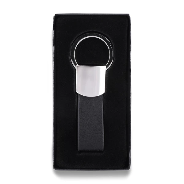 Brelok wykonany z połączenia błyszczącego metalu z ekoskórą. Pakowany w czarne opakowanie upominkowe
