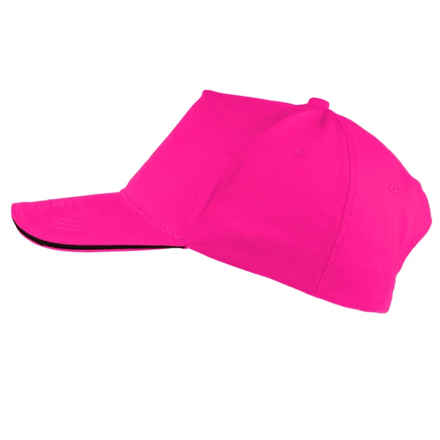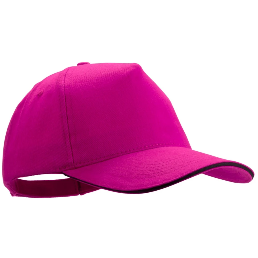 5 panel cap in brushed cotton material. In a wide range of bright tones, with colored sandwich and padded visor. Embroidered ventilation holes and adjustable velcro closure.