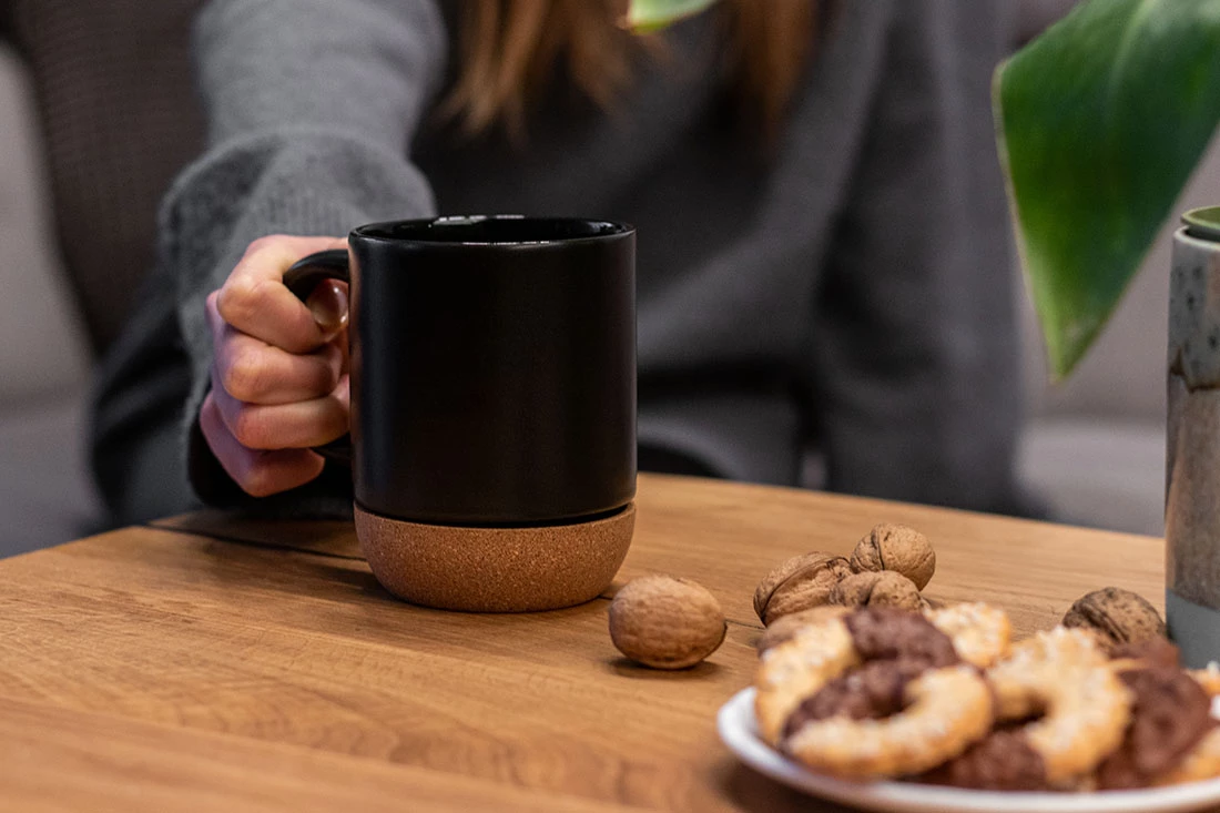 Ceramic mug with a cork saucer. The 350 ml capacity allows you to prepare a large portion of your favourite drink. The large handle guarantees comfortable holding of the cup. A removable saucer made of natural, biodegradable cork perfectly fits the cup and ensures that the mug with the hot drink will not leave any permanent marks on a wooden table.