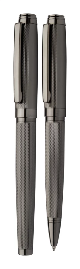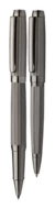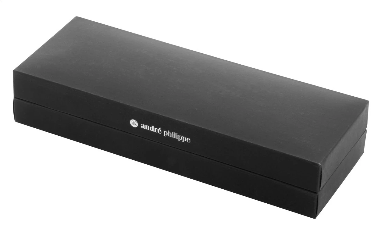 Elegant, metal ballpoint pen and roller pen set with patterned barrel. In black gift box, with blue refill. André Philippe brand product.