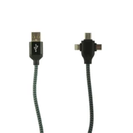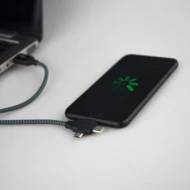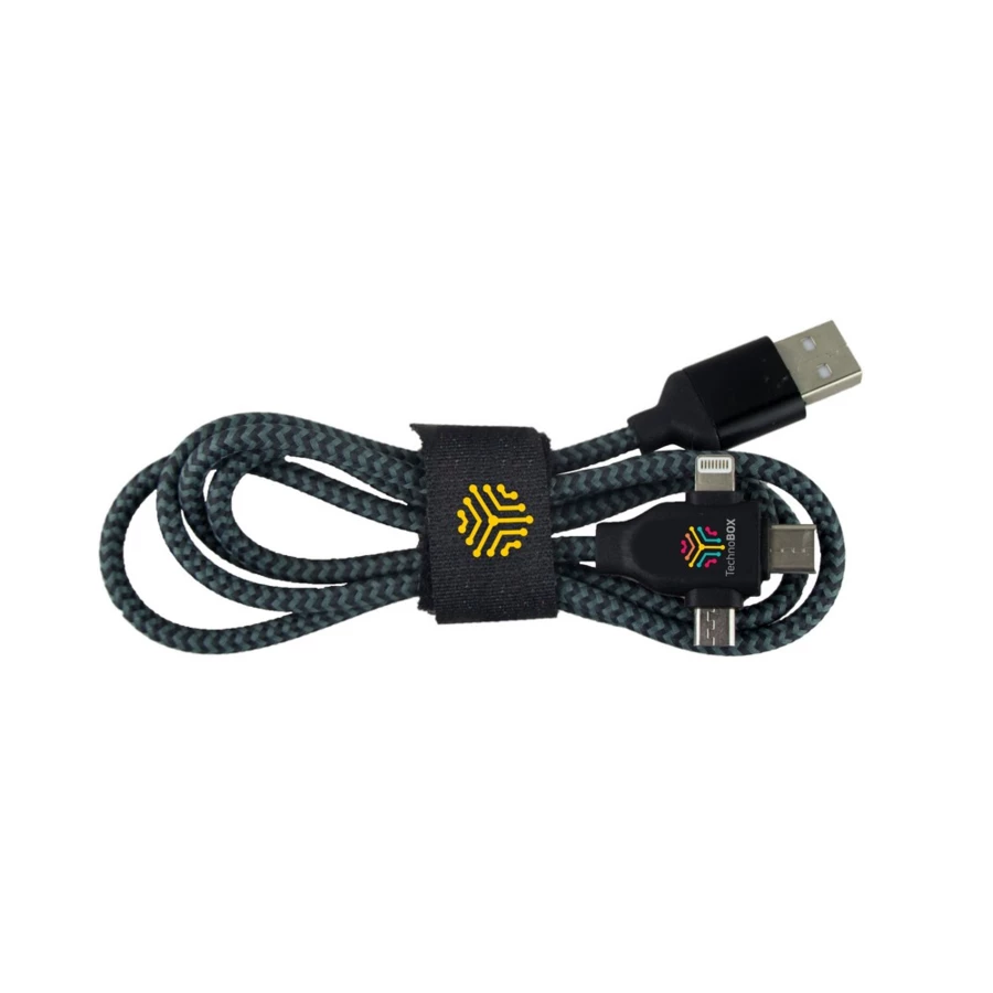 Charging and synchronization cable with 4 plugs: USB, USB-C, micro USB and compatible with iOS devices, maximum charging power USB-C to USB-C 10W, USB-C to iOS 10W, USB to micro USB 10W, 100 cm length, hook and loop strip with place for personalization included