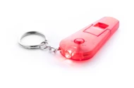 Transparent coloured plastic whistle with keyring and mini flashlight. With button cell battery.