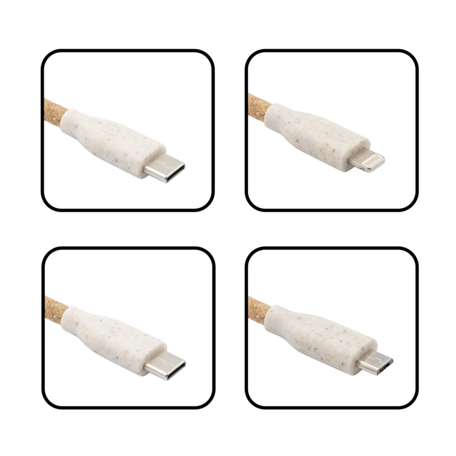 Charging cable B’RIGHT, made of cork, wheat straw elements, 120 cm length, 4 plugs: 2x USB-C, USB and micro USB and compatible with iOS devices, maximum charging power USB-C to USB-C 60W, other connectors 12W, USB-C plug with synchronization function