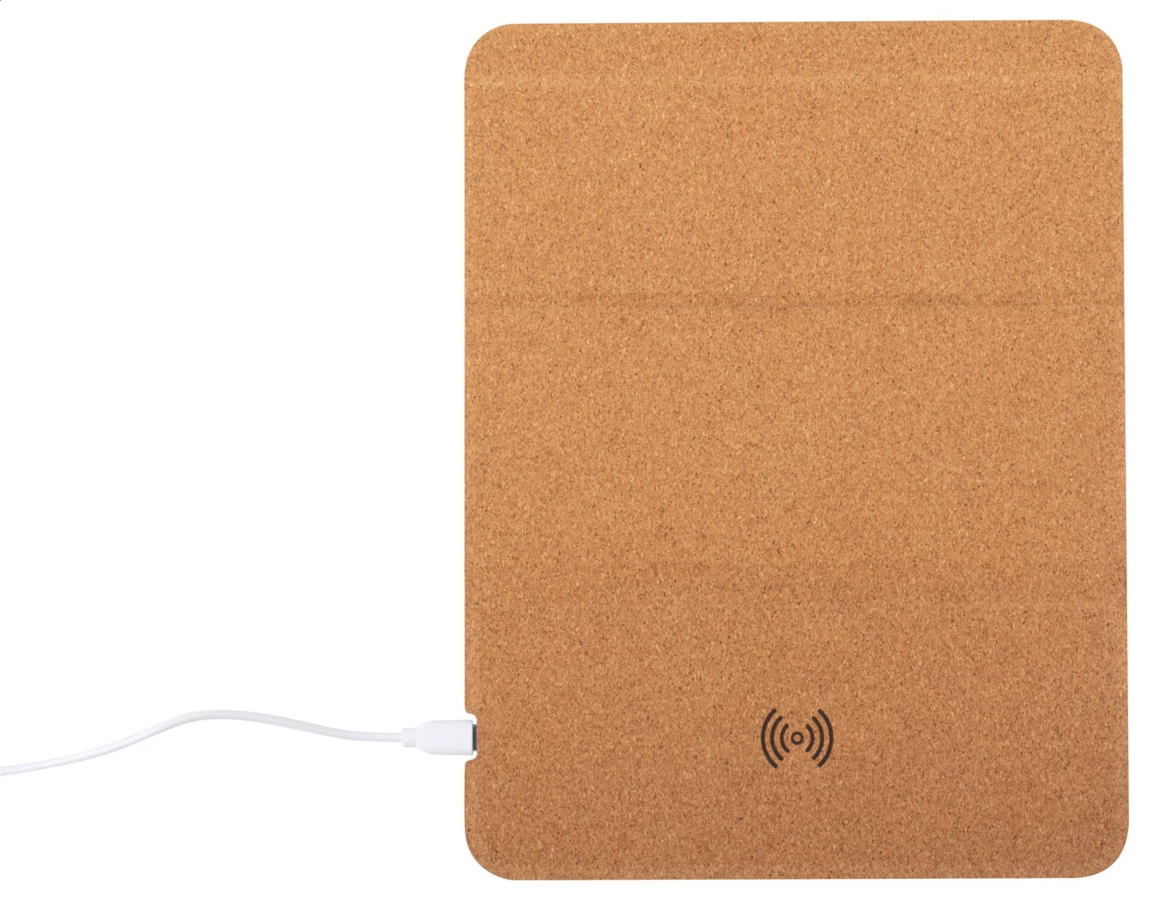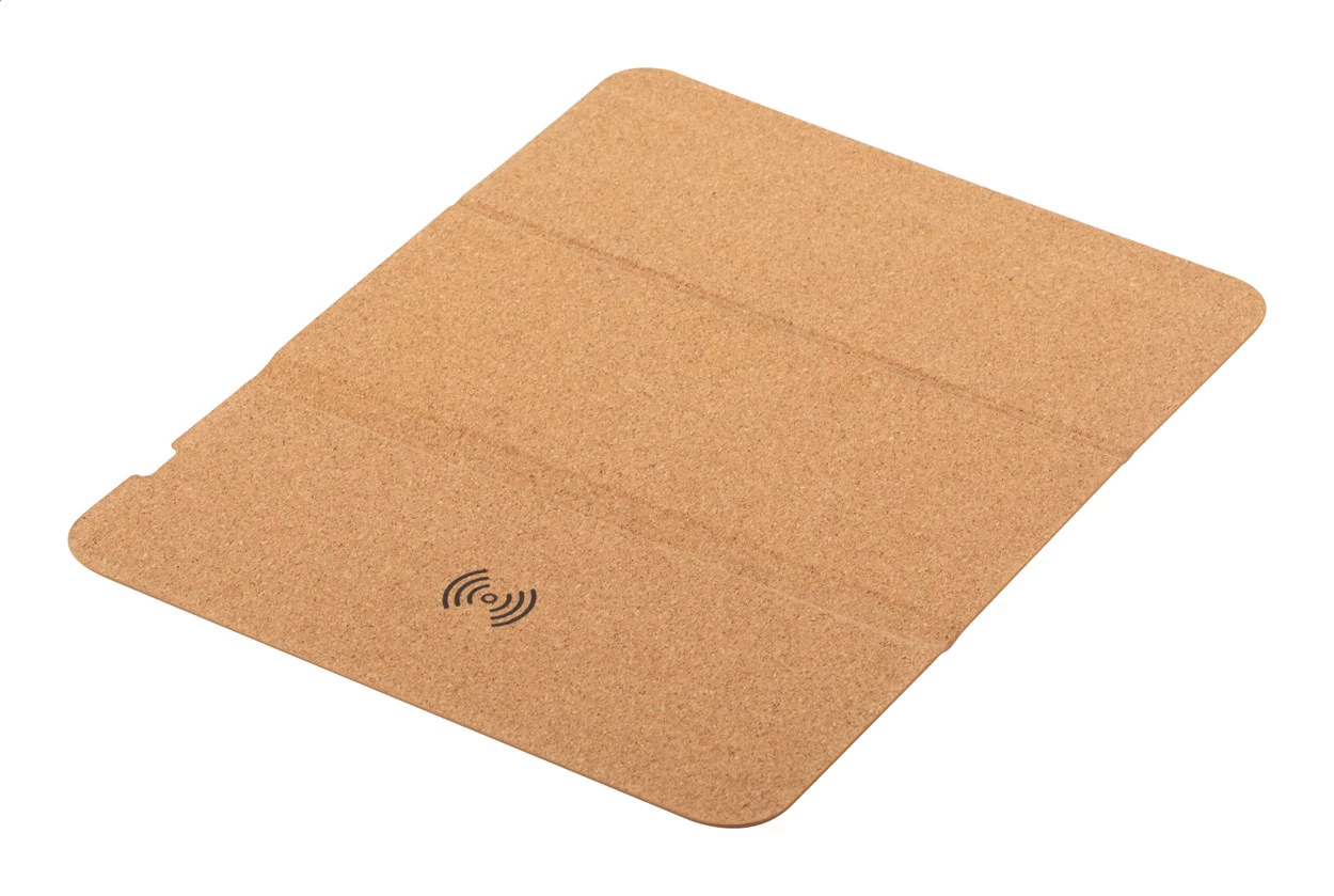 Natural cork mouse pad with built-in wireless charger (5W) and integrated mobile phone holder. Including USB charger cable.