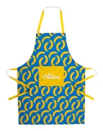 Custom made 600D RPET polyester apron with front pocket and all over sublimation printed graphics. MOQ: 25 pcs.