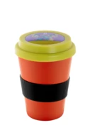 Customisable, double-wall plastic thermo cup with drinking lid and silicone grip. 300 ml. MOQ: 50 pcs.