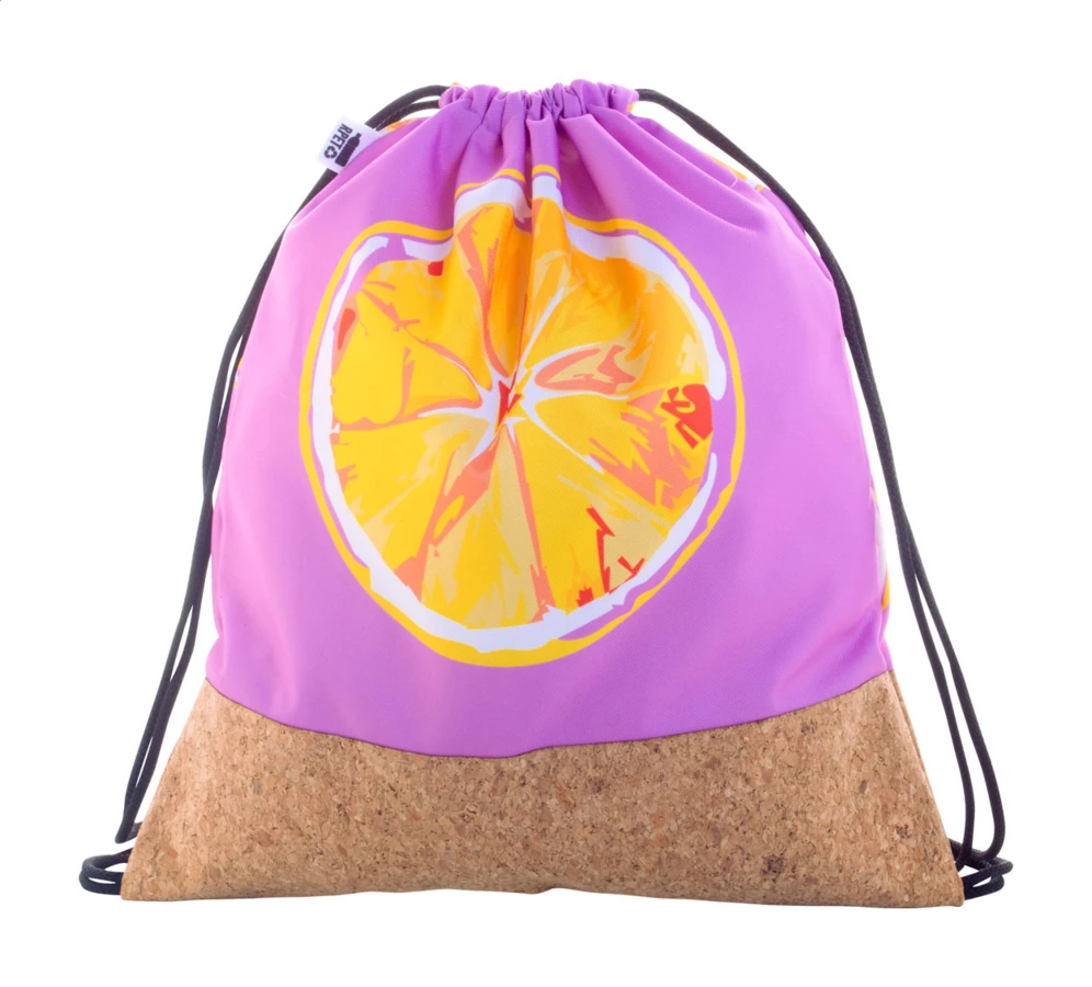 Custom made drawstring bag in 600D RPET polyester and natural cork. With all over sublimation printed graphics and distinctive RPET label. MOQ: 25 pcs.
