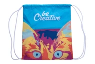 Custom made drawstring bag with coloured strings, 190T polyester. With all over sublimation printed graphics. MOQ: 25 pcs.