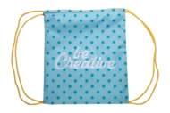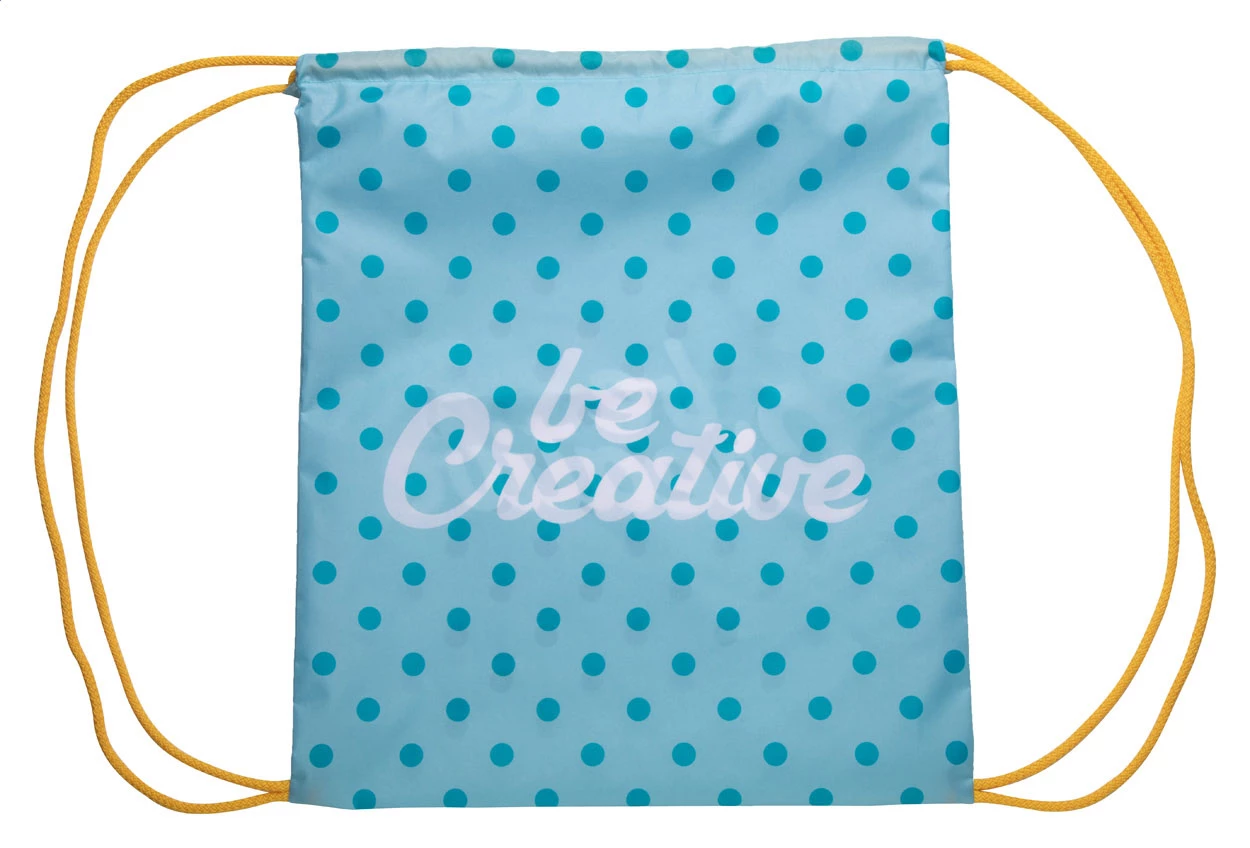 Custom made drawstring bag with coloured strings, 190T polyester. With all over sublimation printed graphics. MOQ: 25 pcs.