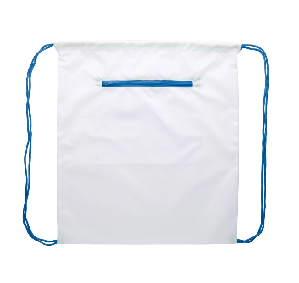 Custom made drawstring bag with zipped, RFID protected front pocket, 190T polyester. With all over sublimation printed graphics. MOQ: 25 pcs.