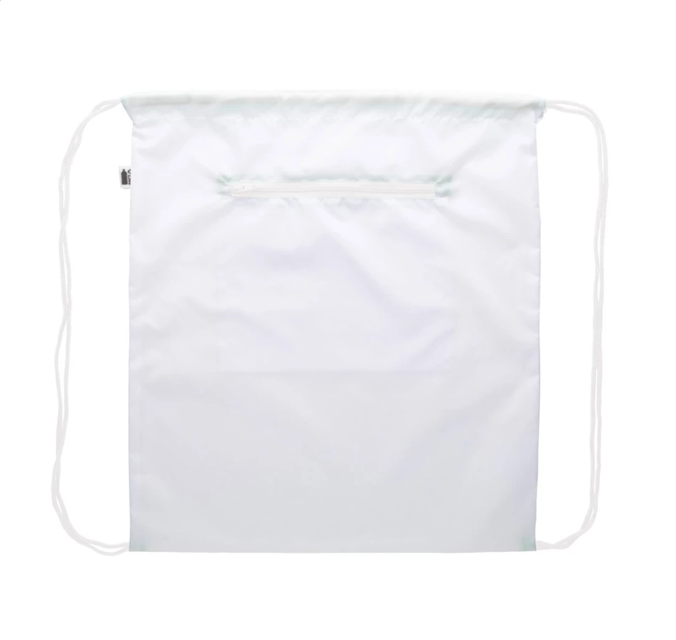 Custom made drawstring bag with zipped, RFID protected front pocket, 190T RPET polyester. With all over sublimation printed graphics and distinctive RPET label. MOQ: 25 pcs.