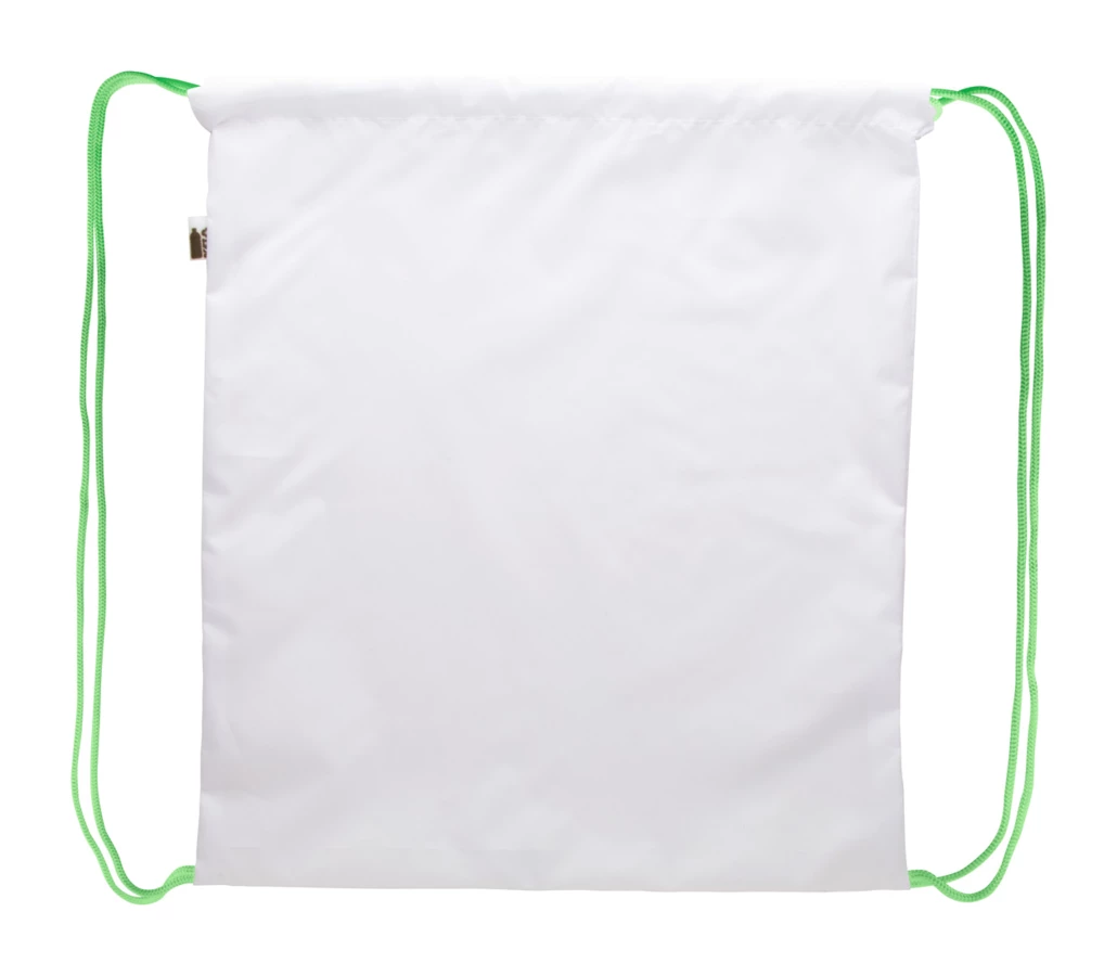Custom made drawstring bag with coloured strings, 190T RPET polyester. With all over sublimation printed graphics and distinctive RPET label. MOQ: 25 pcs.