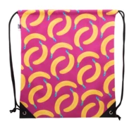 Custom made drawstring bag in 600D RPET polyester, with reinforced PU leather corners and thick matching colour strings. With all over sublimation printed graphics and distinctive RPET label. MOQ: 25 pcs.