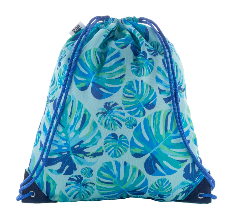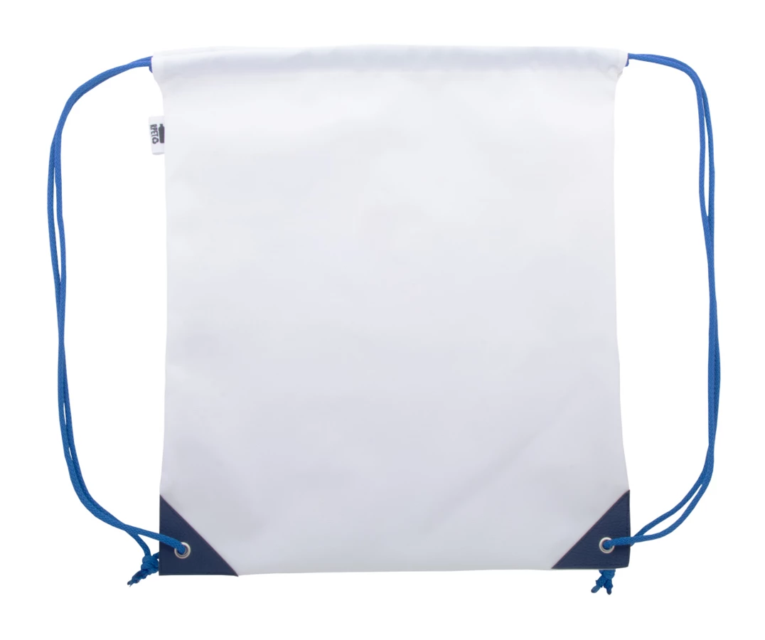 Custom made drawstring bag in 600D RPET polyester, with reinforced PU leather corners and thick matching colour strings. With all over sublimation printed graphics and distinctive RPET label. MOQ: 25 pcs.
