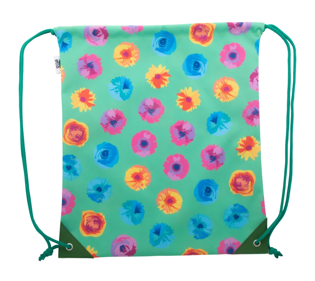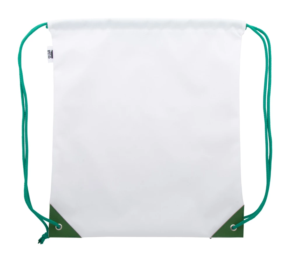 Custom made drawstring bag in 600D RPET polyester, with reinforced PU leather corners and thick matching colour strings. With all over sublimation printed graphics and distinctive RPET label. MOQ: 25 pcs.