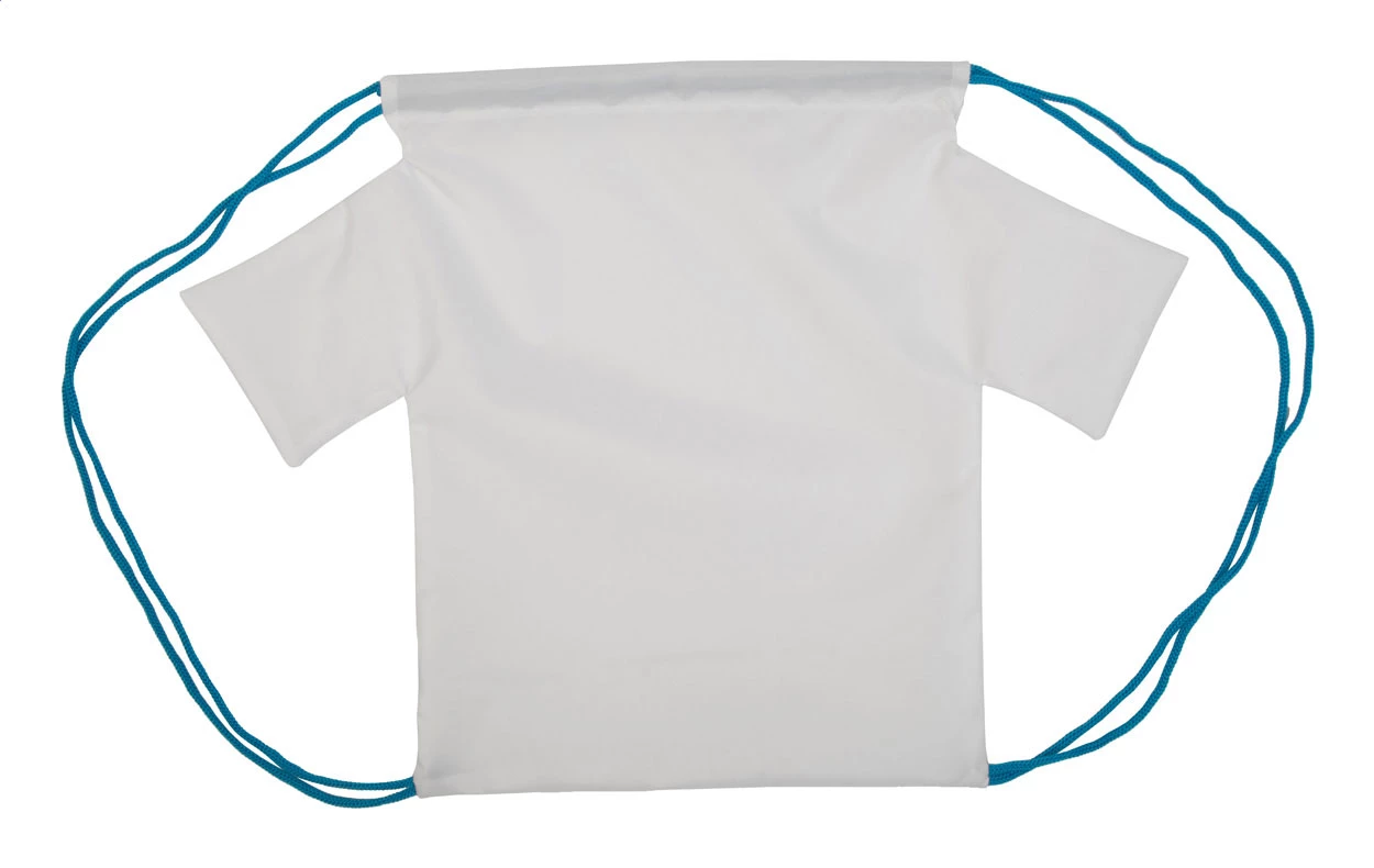 Custom made, T-shirt shaped drawstring bag with coloured strings, 190T polyester. With all over sublimation printed graphics. MOQ: 25 pcs.
