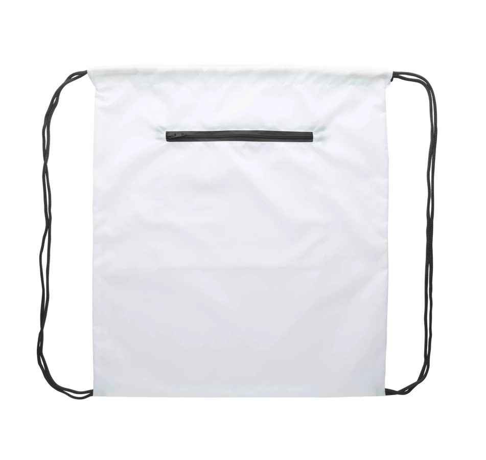 Custom made drawstring bag with zipped front pocket, 190T polyester. With all over sublimation printed graphics. MOQ: 25 pcs.