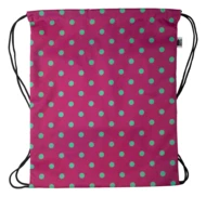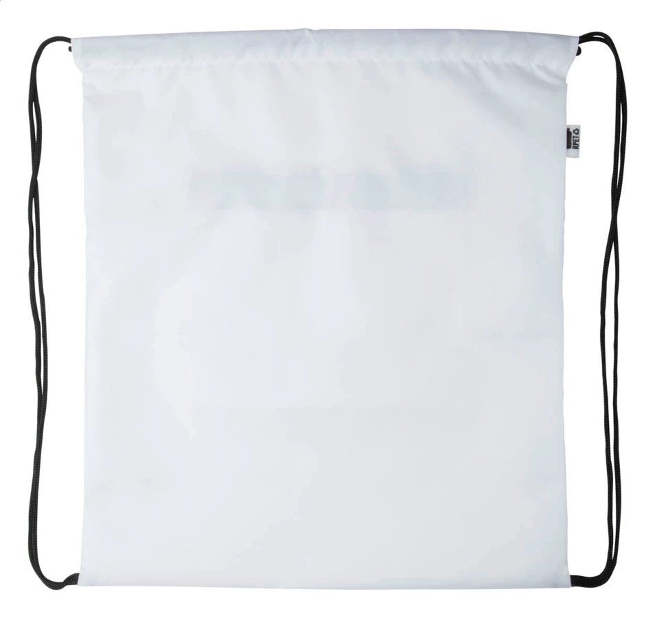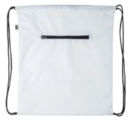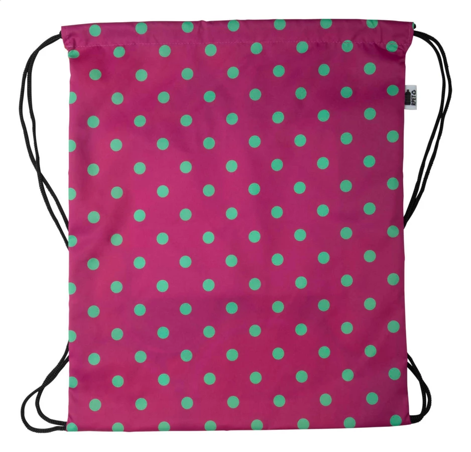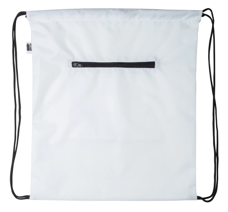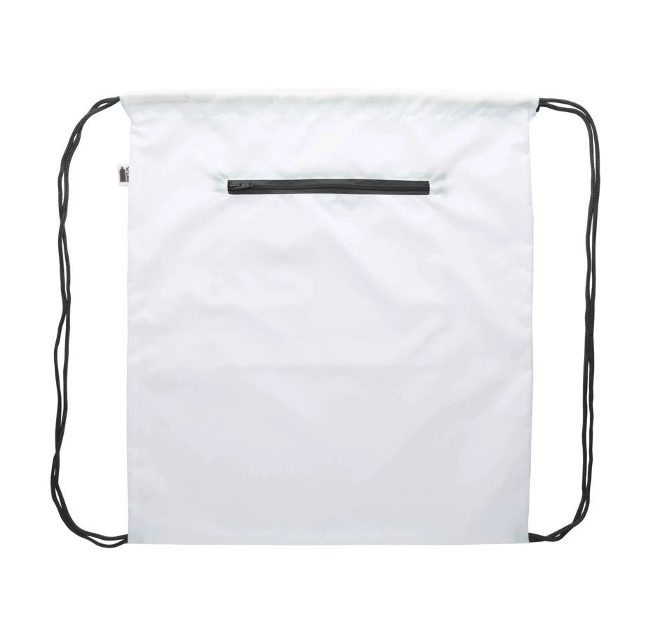 Custom made drawstring bag with zipped front pocket, 190T RPET polyester. With all over sublimation printed graphics and distinctive RPET label. MOQ: 25 pcs.