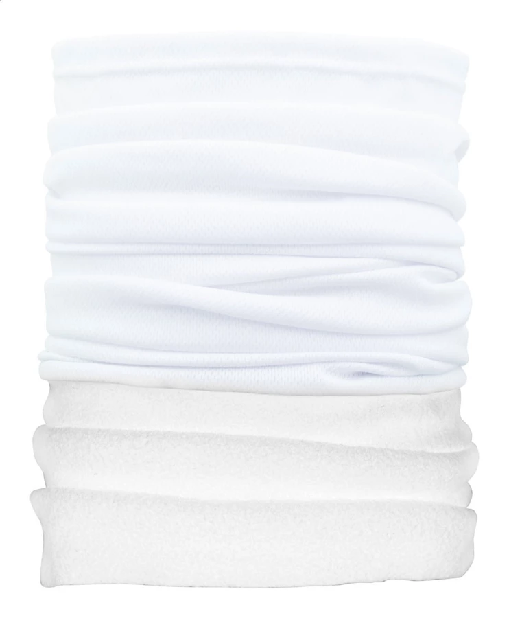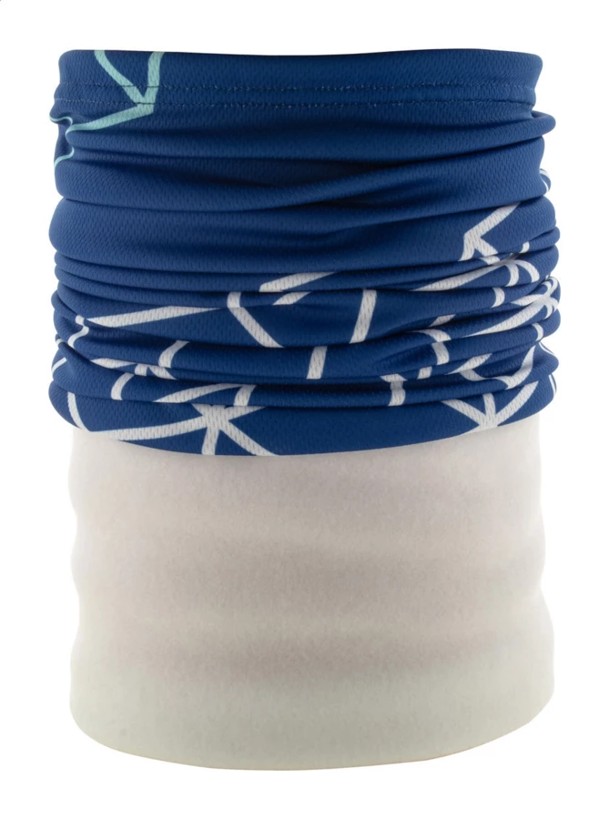 Custom made, multipurpose scarf in breathable and quick-drying polyester, with coloured polar fleece neck warmer. With all-over sublimation printed graphics on the polyester part. Made of 100% polyester (135 g/m²) and polar fleece (160 g/m²) fabrics. MOQ: 100 pcs.