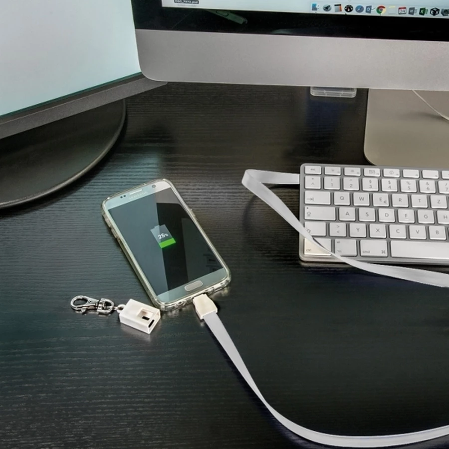 Plastic lanyard with universal charging cable (for Android and IOS) and small snap hook. Your logo will be printed on the lanyard (only 1 colour print possible).