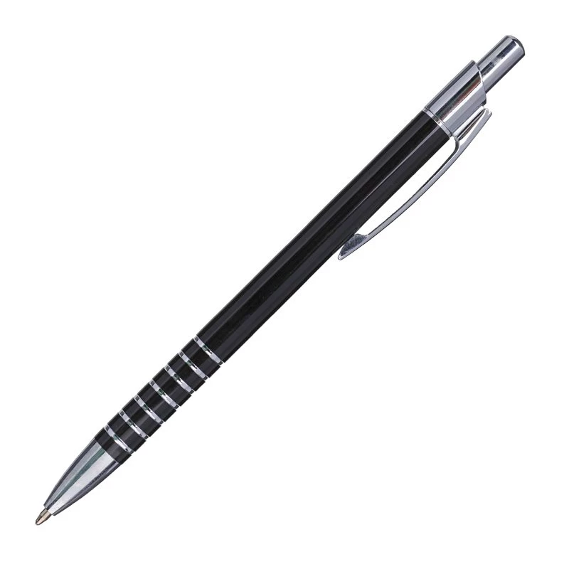 Aluminiowy długopis z metalową skuwką. Wyposażony w niebieski wkład.