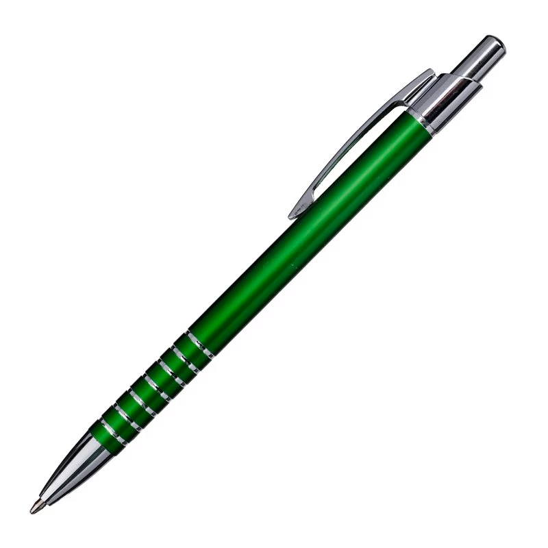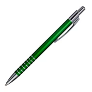 Aluminiowy długopis z metalową skuwką. Wyposażony w niebieski wkład.