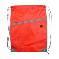 Drawstring bag, string allows it to be worn on the back, reinforced corners reduce the risk of material tearing, can fit small groceries or workout clothes for the gym, features zipped front pocket and opening for headphone or power bank cable (not included), product made from polyester 210D