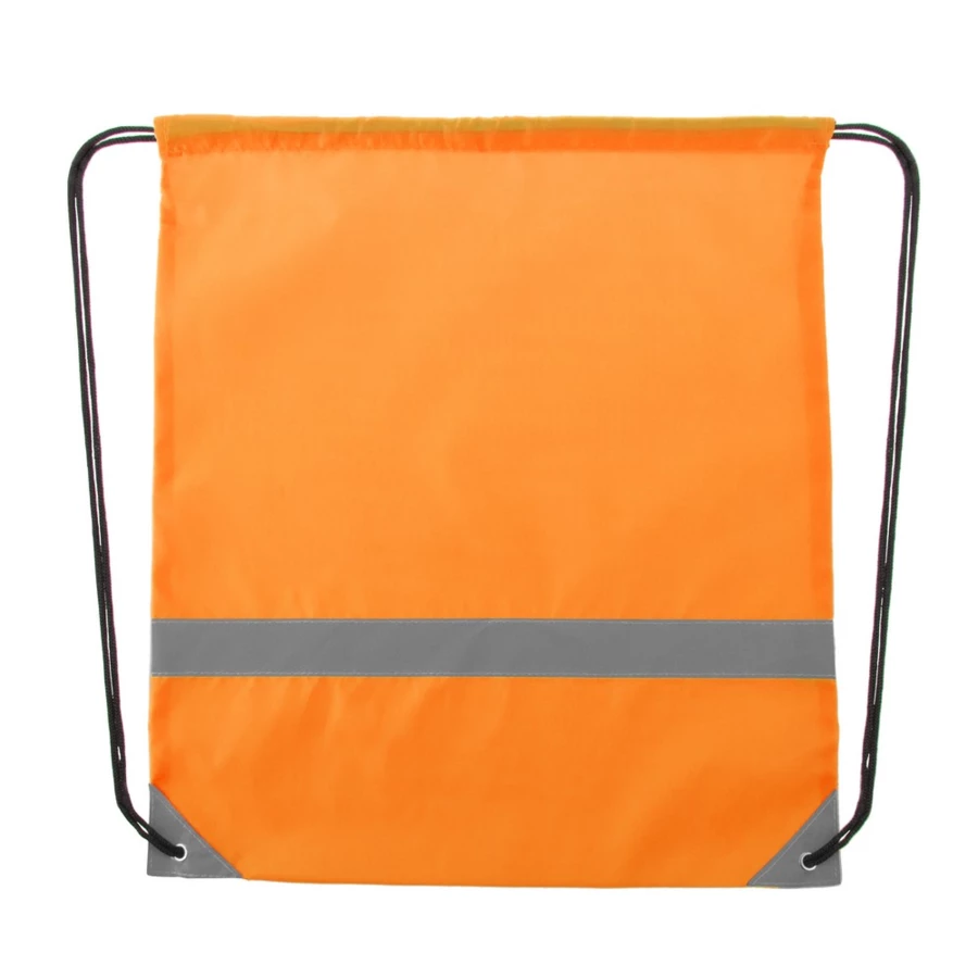 Reflective backpack in soft polyester 190T in bright tones, with reflective front strip. Self closing black strings and reflective corners reinforced with metal rings.