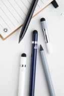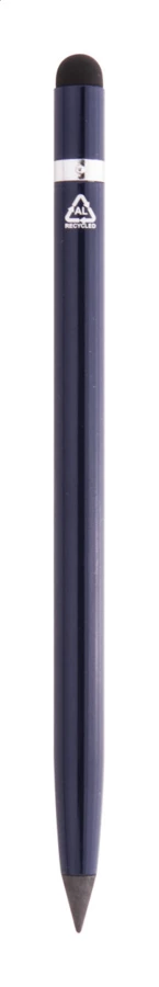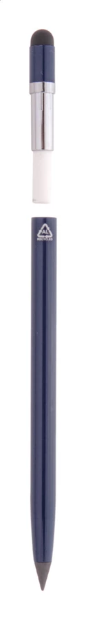 Recycled aluminium, long-lasting inkless pen with touch screen stylus and metal alloy tip, which oxidizes the paper. This pen writes similarly to a pencil and it is also erasable. Including eraser on the inside of the touch stylus.