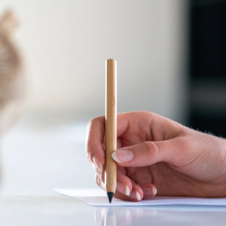 Fountain pencil made of light bamboo. Its phenomenon lies in the fact that instead of the standard graphite insert, a special metal alloy is used, which turns the paper graphite in color.