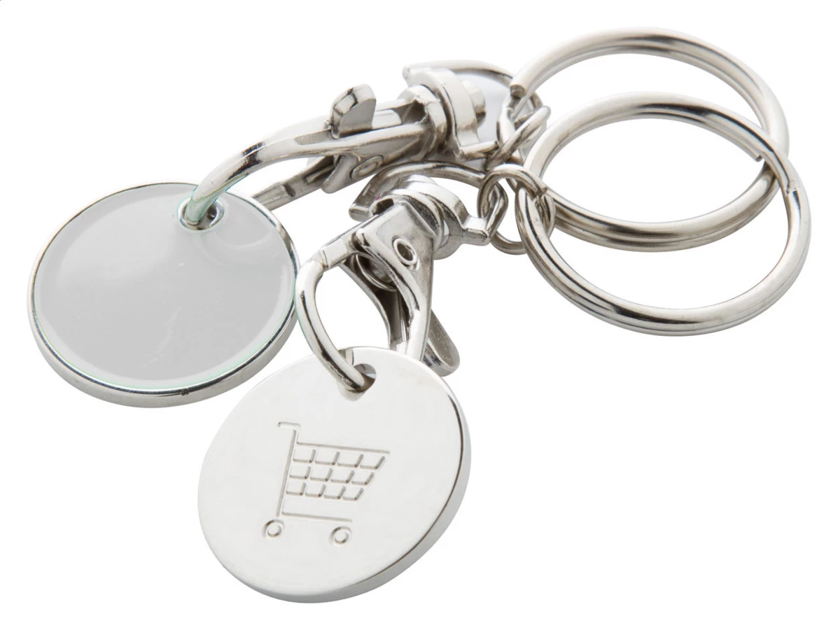 Metal keyring with shopping trolley coin. One side of the coin is painted, the other side has an engraved shopping trolley. Coin size: ø23×1,7 mm.