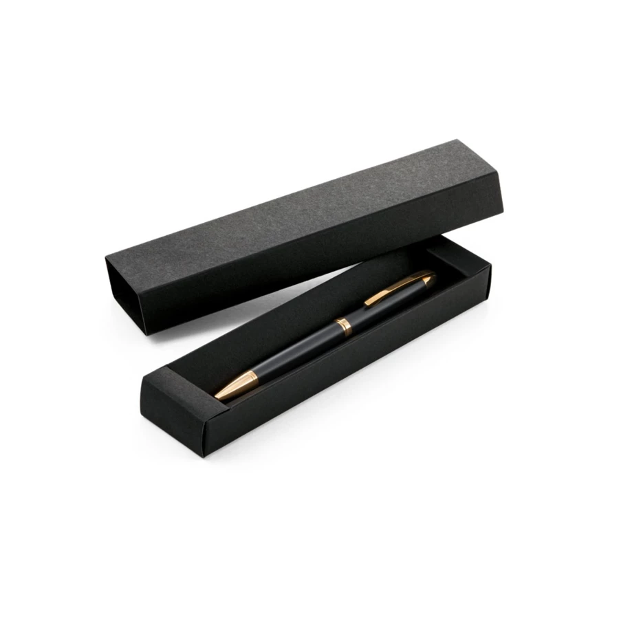 Metal ball pen with twist mechanism, clip and golden trim. Blue ink. Supplied in a kraft paper case. ø11 x 139 mm | Case: 180 x 43 x 22 mm