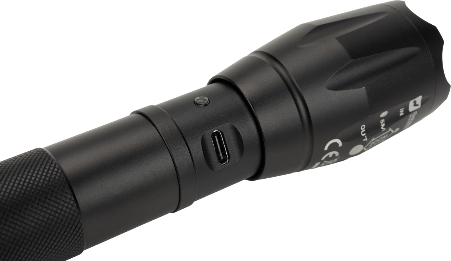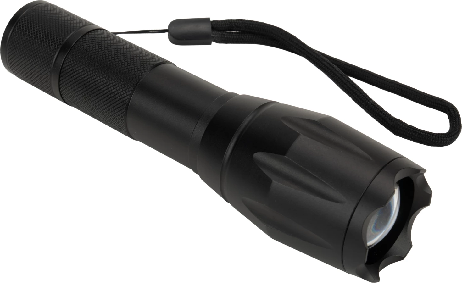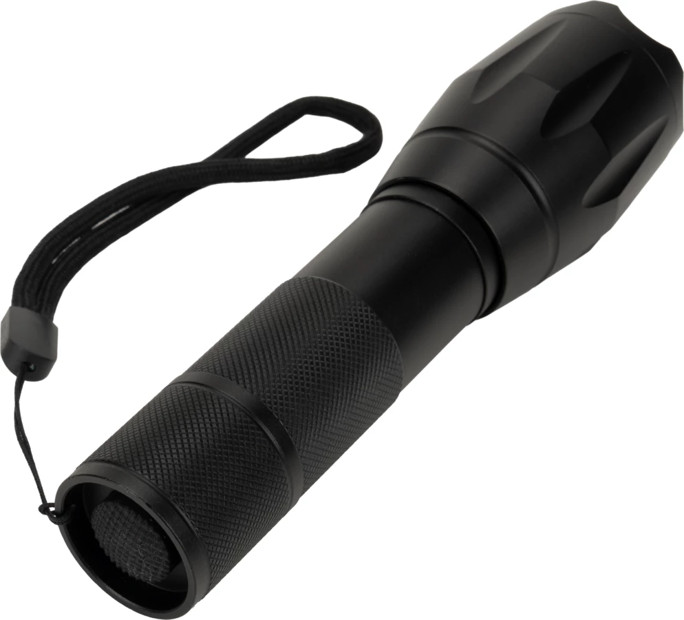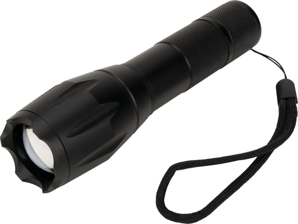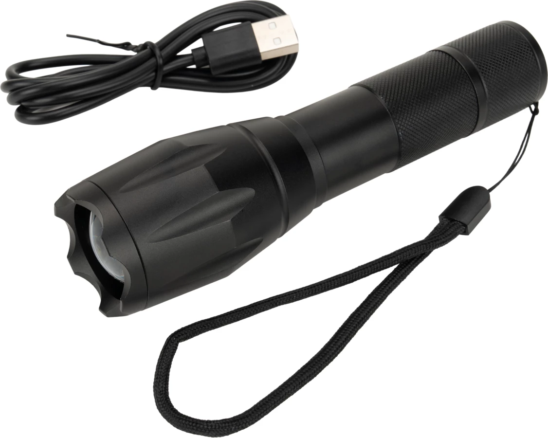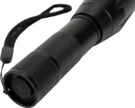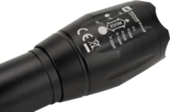 Flashlight with wrist strap that contains CREE T6 diode. Thanks to the extending head it allows you to regulate the focalization and switch power of the light. It has 5 modes of lighting: weak, medium, stronger, flashing and SOS. Comes with a rechargeable battery with 2200 mAh capacity and USB Micro cabel. Flashlight can be also used with 3 AAA bateries. Luminosity: 270 lumens