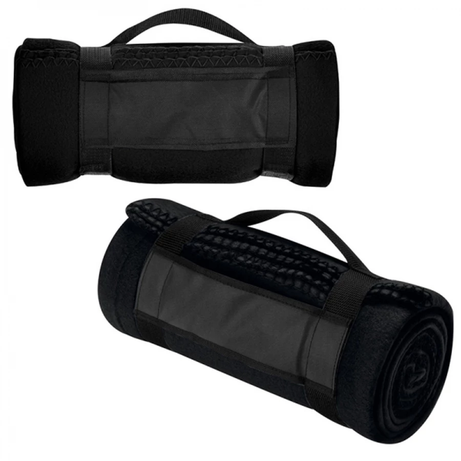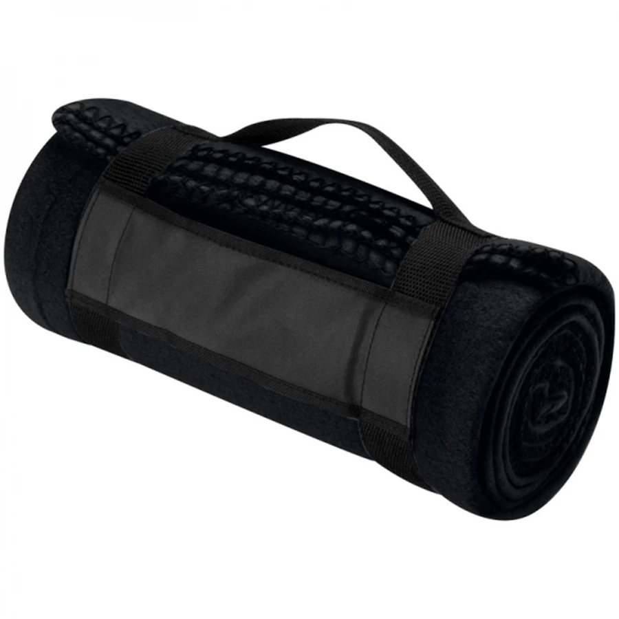 Snugly! This fluffy fleece blanket with carrying strap is ideal for getting cozy at home, or keep it in the car, as it is ideal for a picnic, camping, etc. Please check size when buying the blanket. We will print your logo onto the black surface between the straps. Grammage 170 gsm